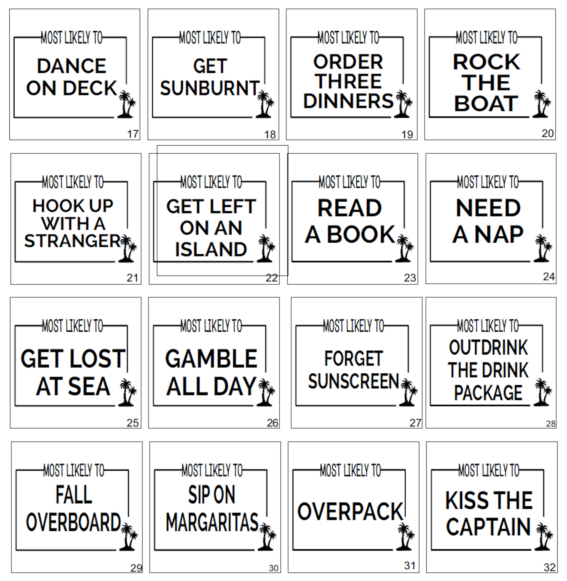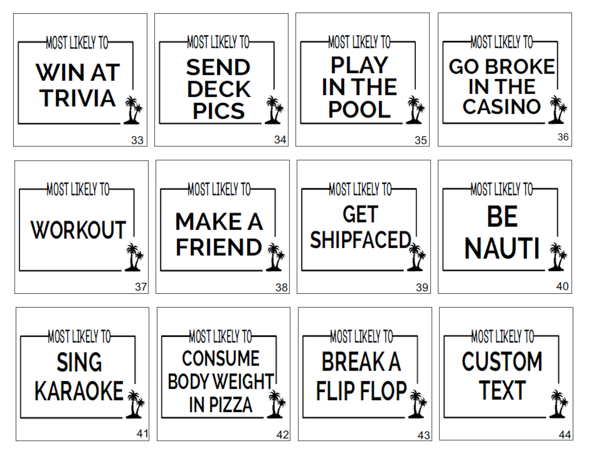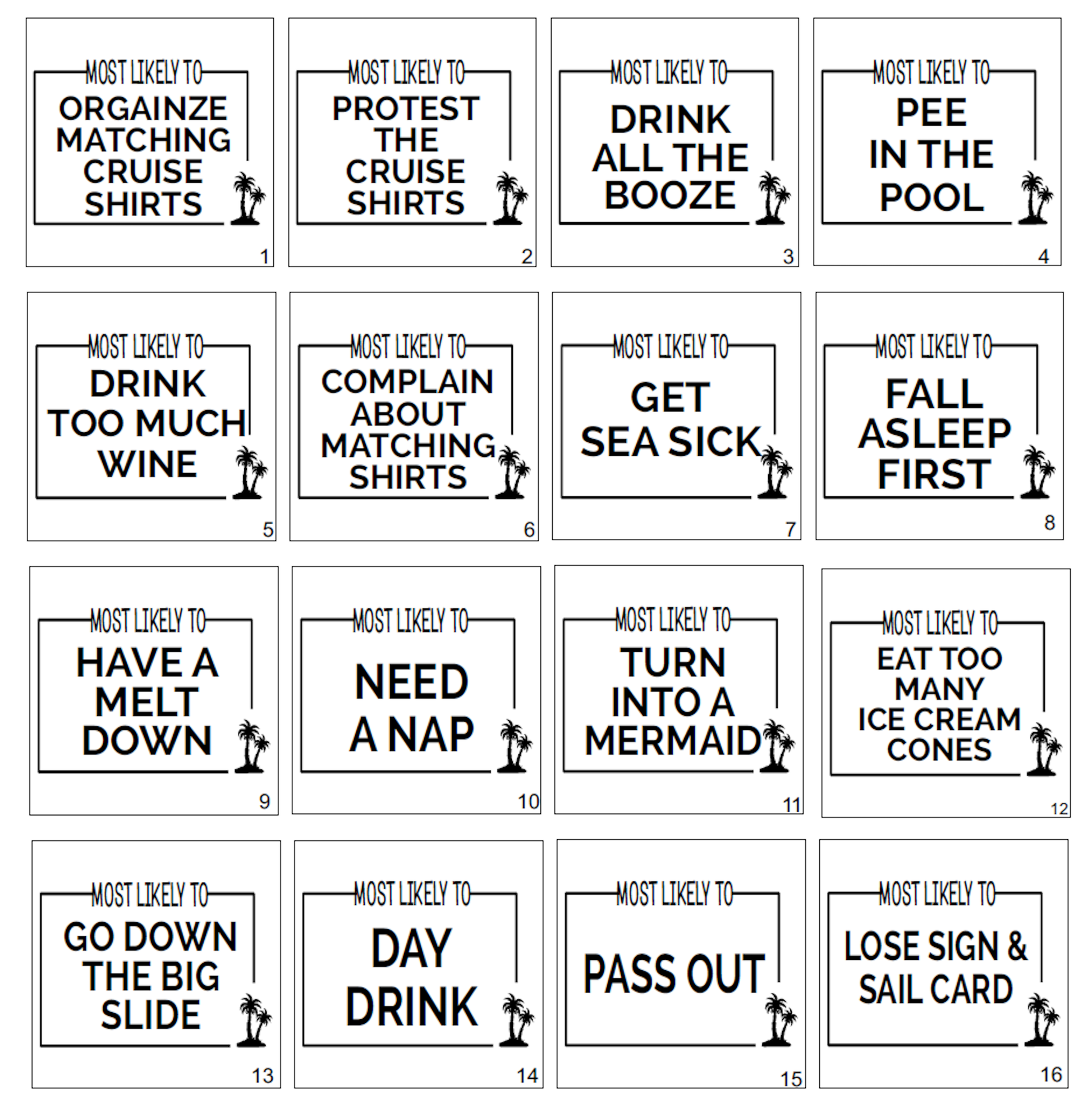 Let each person in your group celebrate their unique place in the group with these "Most Likely To" shirts for your next cruise vacation. We've got 40+ sayings to choose from, or choose your own saying to pick what each member of your group is truly most likely to do.